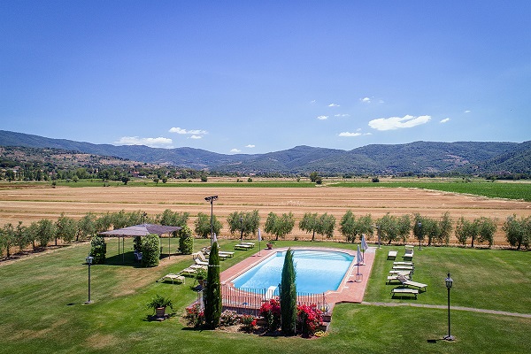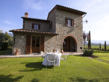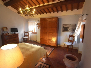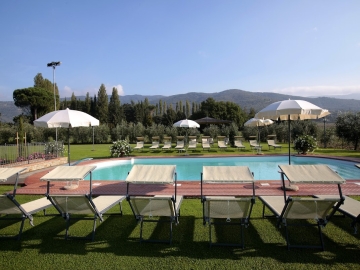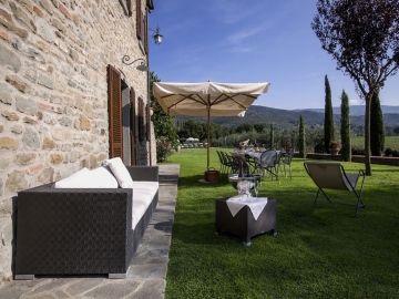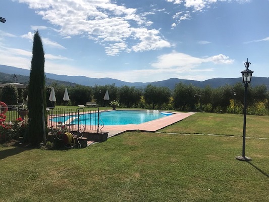Buiten: zwembad 14 x 7 m (1.20m - 2.40m diep, met treden om het water in en uit te gaan), zeer grote tuin, overdekt terras, buitenverlichting, parking, uitzicht over de heuvels en op Cortona.