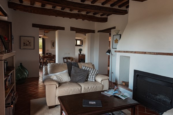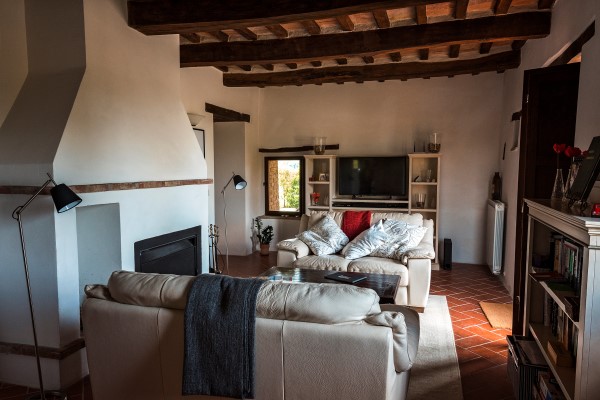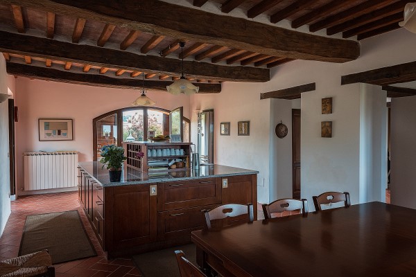 De villa heeft meer toegangen, maar de hoofdingang is dicht bij het parkeerterrein. Via deze deur kom je in de woonkamer met een open haard (geïmporteerd uit Australië!) en een uitnodigende leren banken, een ‘entertainment unit’ met een televisie met satelliet aansluiting, Dvd-speler en een geluidsinstallatie. Aangrenzend is de ruime keuken/eetkamer met een schitterend granieten keukenblad en een houten kookeiland met afzuigkap, grote oven, vaatwasser, magnetron en met genoeg bestek, glazen en borden om met een grote groep te genieten van onvervalst Italiaans eten en drinken. De imposante kastanjehouten eettafel is gemaakt door lokale ambachtslieden (en ook overigens de bedden, inbouwkasten en andere meubelen) en is geschikt voor twaalf personen. Op de begane grond is een badkamer en een aparte wasruimte, in deze laatste staat een wasmachine, droger, strijkijzer, stofzuiger en wasbak.