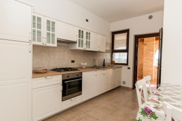Een appartement op de eerste verdieping met volledig ingerichte keuken( geen vaatwasser) met open haard, 3 tweepersoons slaapkamers waarvan 1 met 1 extra eenpersoonsbed en 1 met 1 exta stapelbed. Elke kamer heeft een eigen badkamer. Wasmachine.