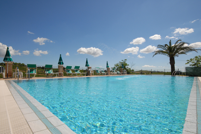 Tussen de 2 gebouwen, waar in totaal de 12 appartementen zijn gevestigd, ligt het grote zwembad (7 x 16m), met een gedeelte voor hydro-massage. Daarnaast is er een kinderbadje. Rondom het zwembad ligt een zeer grote tuin, met ligbedden en parasols.