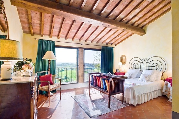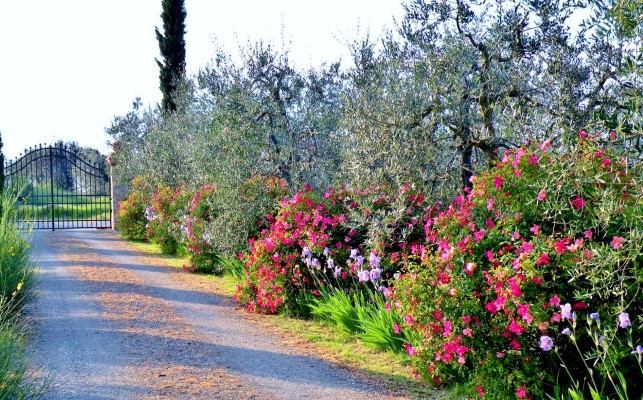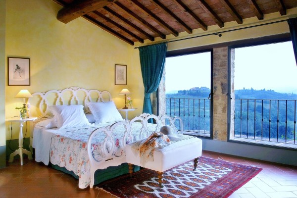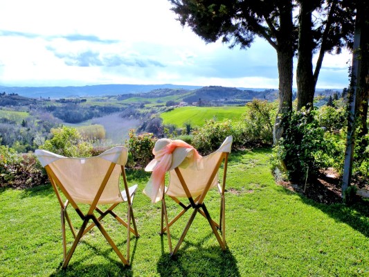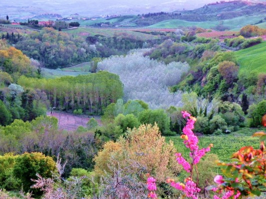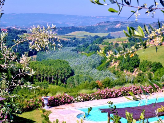 Het uitzicht over de Valdelsa-vallei is panoramisch en typisch Toscaans: heuvelachtig en overal de velden met kleurschakeringen van de groen-grijze olijfblaadjes en het donkere groen van de cypressen. Dit zorgt werkelijk voor een spectaculaire show van kleuren !! Bovendien liggen op de heuvels de diverse stadjes, zoals San Gimignano.