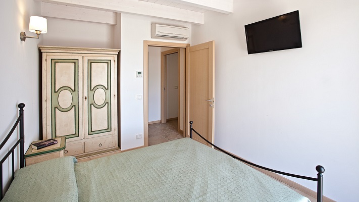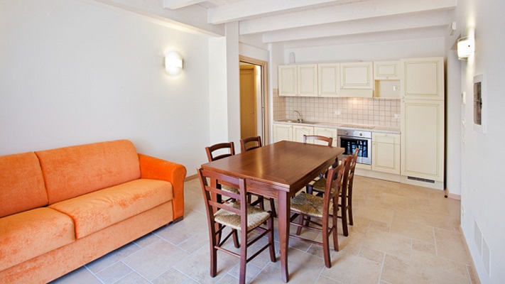 De bilocale vakantie appartementen hebben een slaapkamer met tweepersoons bed, woonkamer met tweepersoonsslaapbank, grote badkamer, keuken met elektrisch fornuis, oven, vaatwasser, koelkast, servies, airconditioning, verwarming, gratis wifi, en 32-inch LCD-TV.