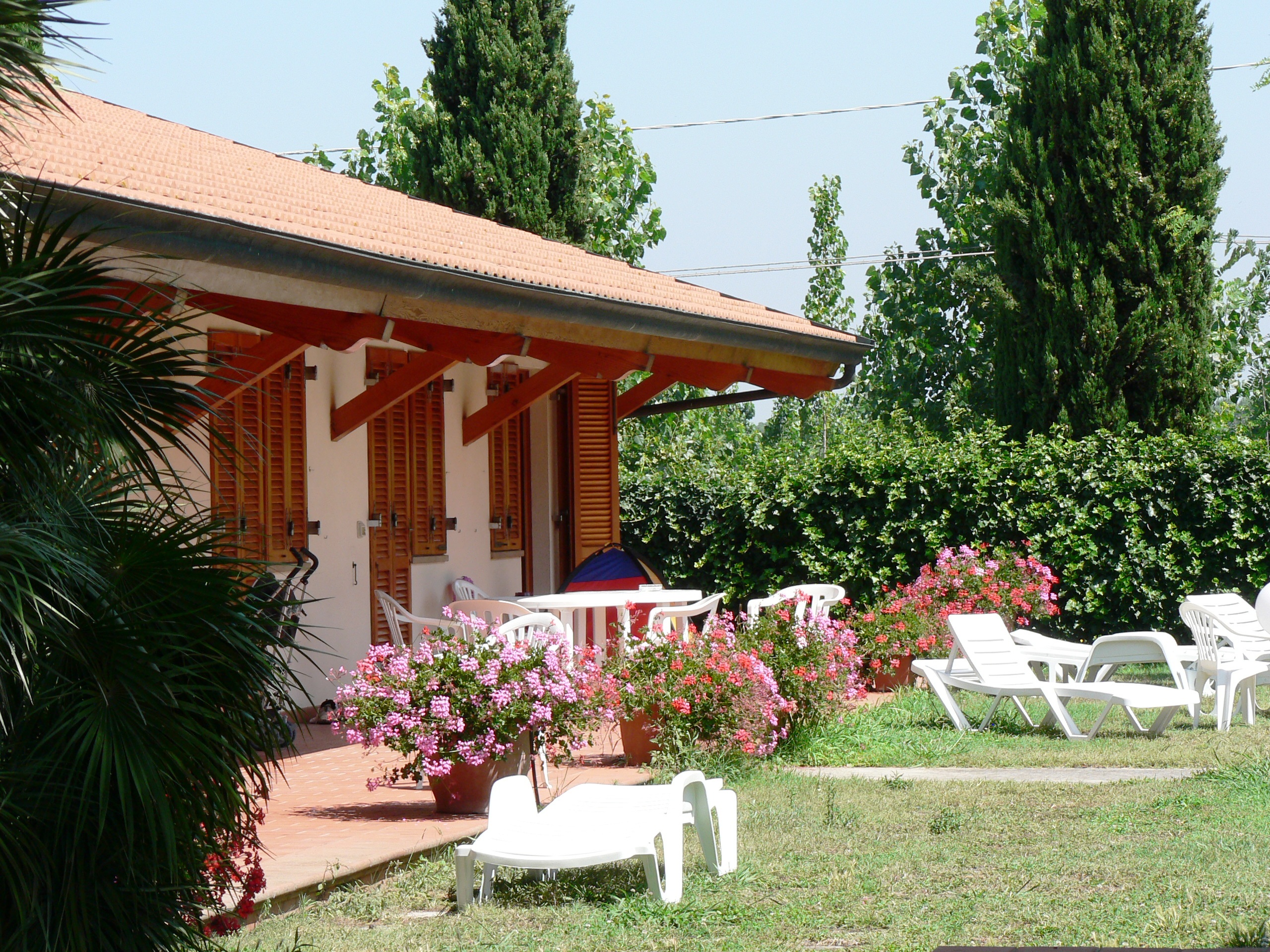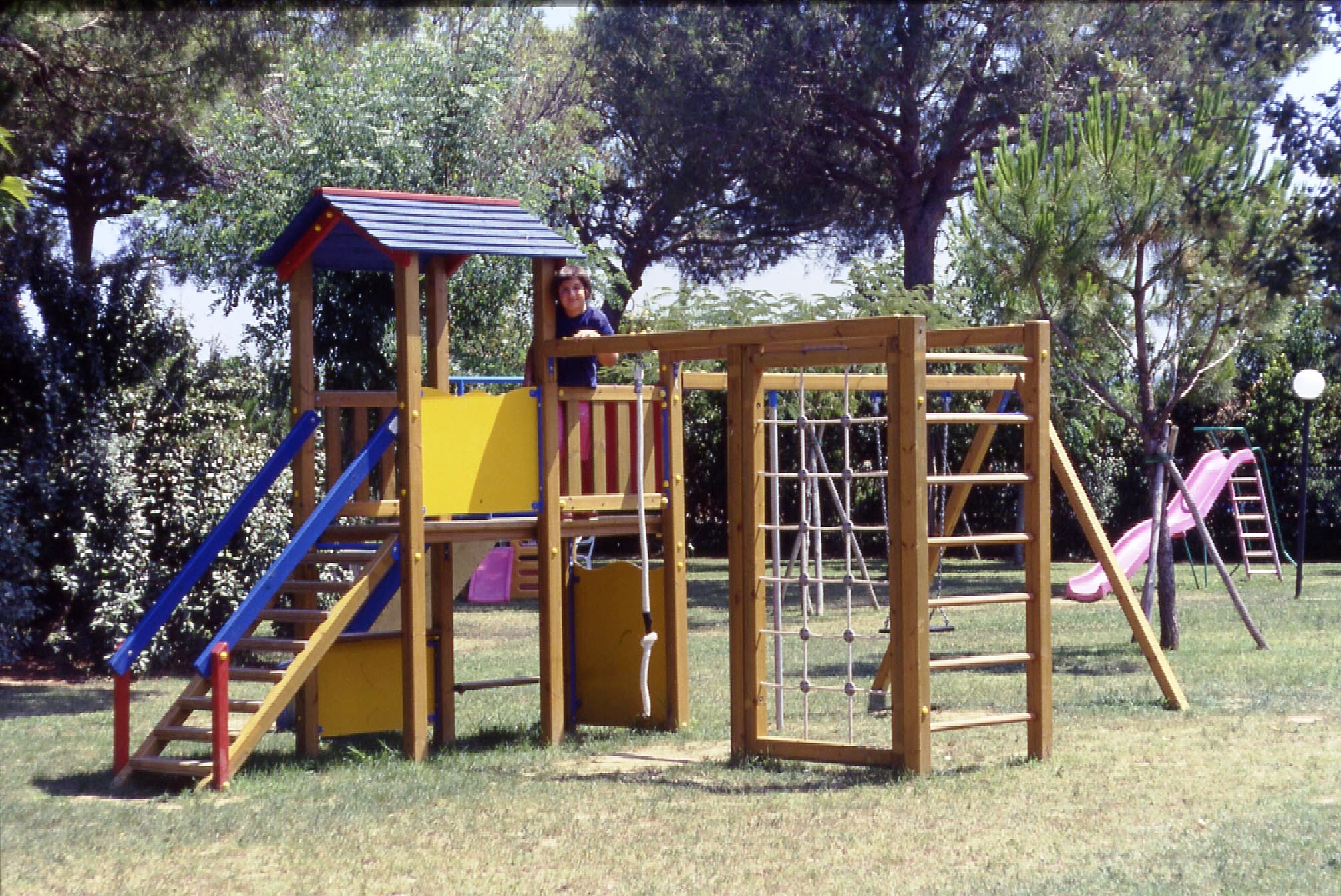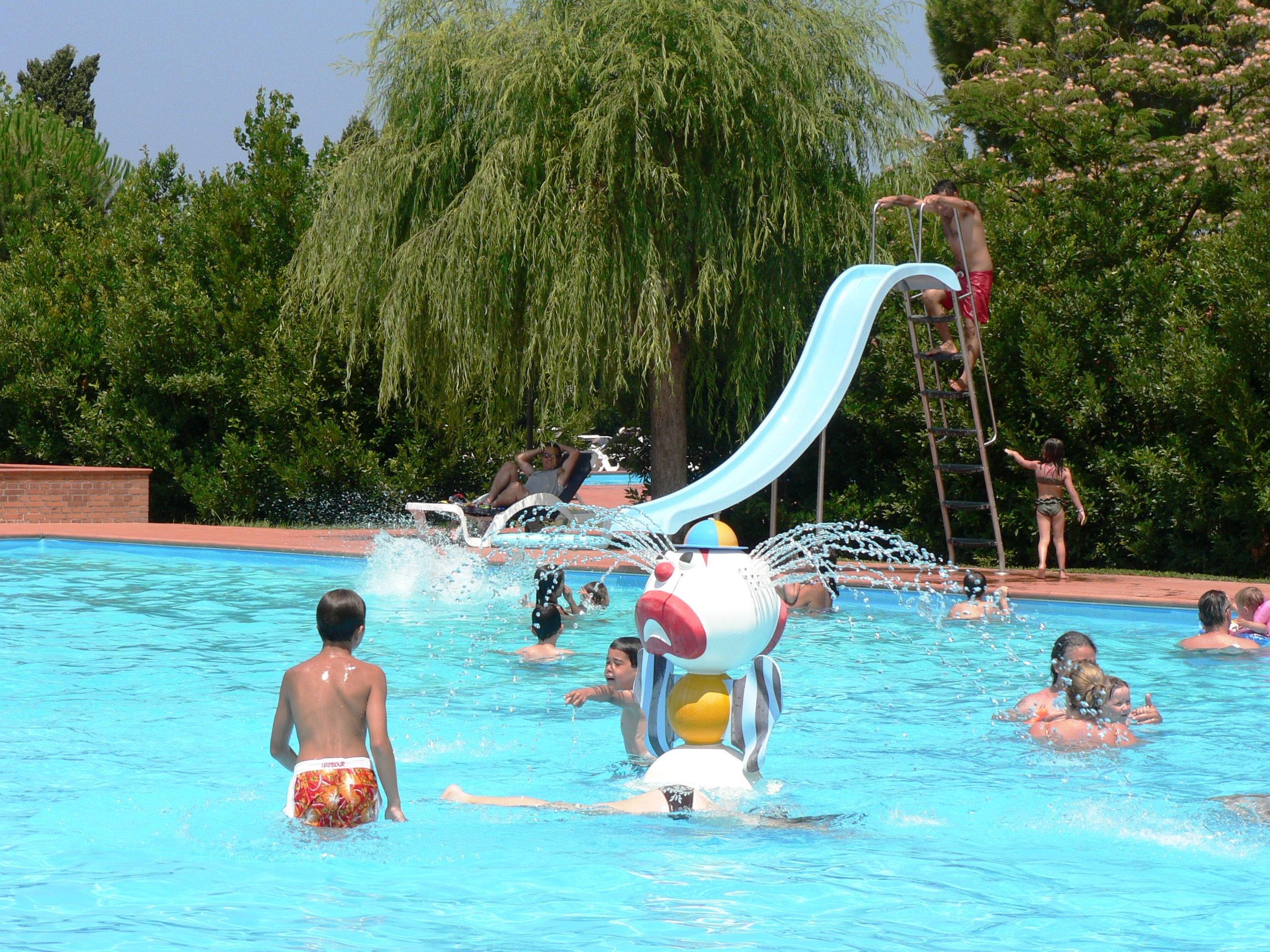 Glijbanen, schommels en andere kinderspelen staan overal door de tuin verspreid, evenals ligstoelen, daar zijn er meer dan genoeg van.
