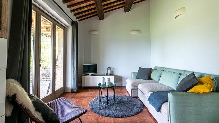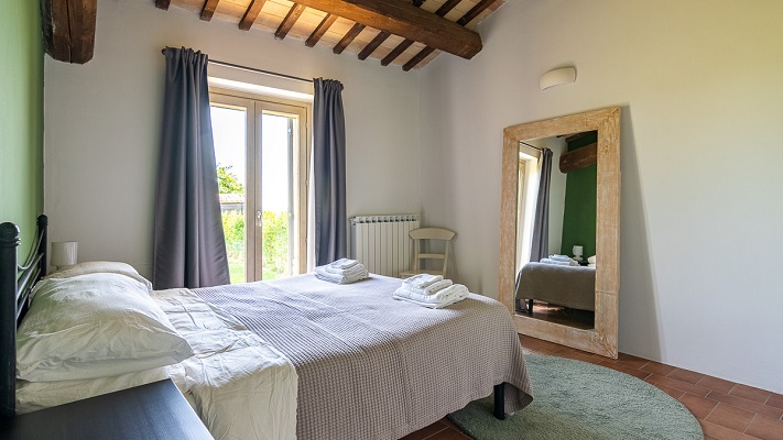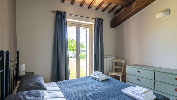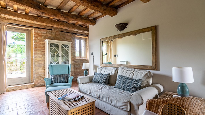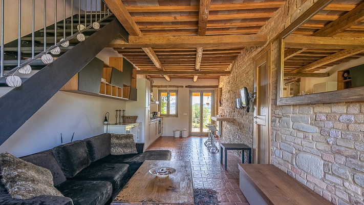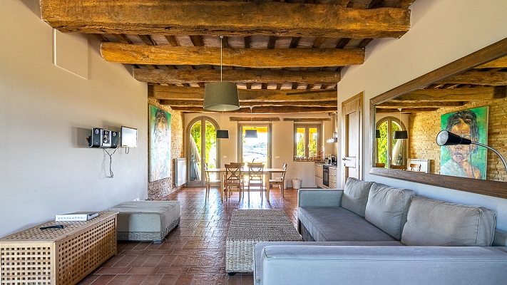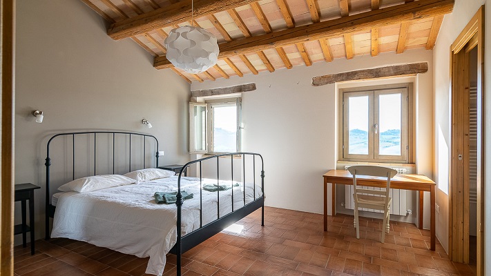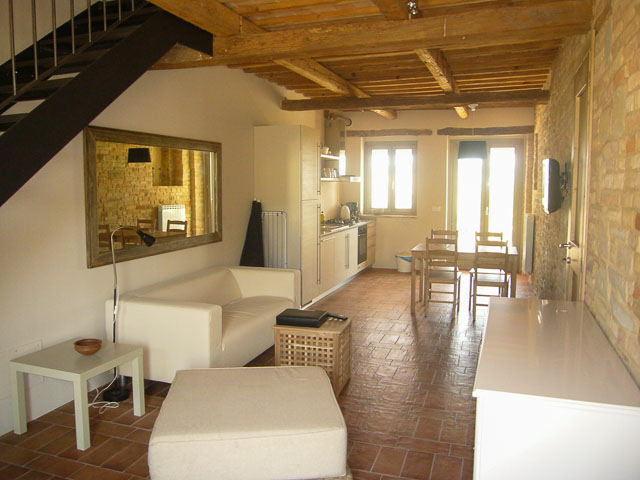 Een eettafel en een woonkamer met een bank, TV en geluidsinstallatie. De tuindeuren geven toegang tot een op het zuiden gerichte overdekte veranda. Van daar heeft men een mooi uitzicht over het zwembad, de glooiende heuvels en de Sibillini bergen. Verder zijn er twee ruime slaapkamers; een met dubbel bed, een met twee enkele bedden, en een gedeelde badkamer (toilet, bidet, douche en wastafel).
