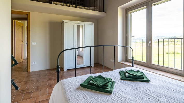 Luxe appartement van 120 m2 voor 6 personen. Beneden heeft Vin Cotto een compleet ingerichte keuken met grootte koelkast met vrieslades, vier pits gasfornuis en oven, afwasmachine, waterkoker en koffiezetapparaat. Een fijne eettafel en een woonkamer met een grootte bank, poef, TV en geluidsinstallatie. Er is een apart toilet waar de wasmachine staat. De grote openslaande tuindeuren geven toegang tot het grootte terras met uitzicht over de tuin en de Marchigiaanse heuvels met op de achtergrond de Sibillini bergen. Op de eerste verdieping bevinden zich de zeer ruime slaapkamers die beiden grote ramen hebben met een fantastisch uitzicht. Een slaapkamer met dubbel bed en eigen badkamer met douche, toilet en wastafel. De andere slaapkamer heeft een twee enkele bedden en op de loft twee enkele bedden. Deze kamer heeft ook een badkamer met douche, toilet en wastafel.