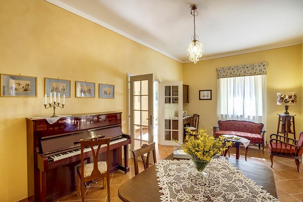 Indeling van de villa: op de begane grond bevinden zich 3 grote vertrekken, waarvan er twee met een openhaard en een met een piano. Deze lounge ruimtes geven direct toegang tot het grote terras. Er bevinden zich hier verder een studeerkamer, een bar met professioneel espresso apparaat en een goed voorziene keuken met 2 koelkasten, een vriezer, magnetron, 2 broodroosters en een sapcentrifuge. Er is hier een kleine woonkamer met tv, er zijn 2 tweepersoonsslaapkames en 1 badkamer met douche.
