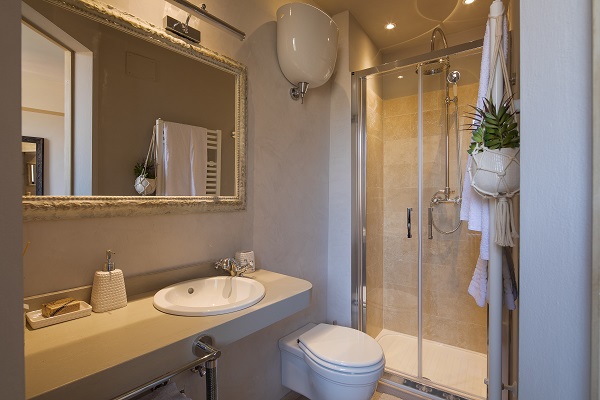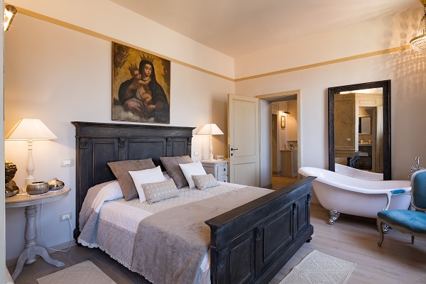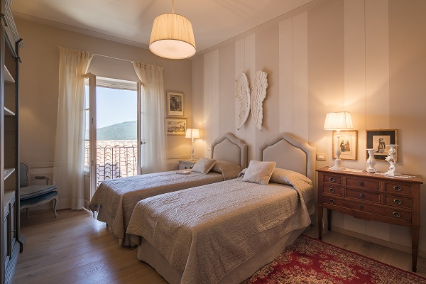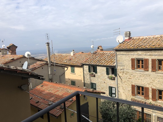 Vanuit hier leiden twee glazen deuren naar het lange privé balkon met tafel en stoelen voor een ontbijtje buiten. Exclusief uitzicht op een deel van het stadje en één van de kerkjes van Cortona.