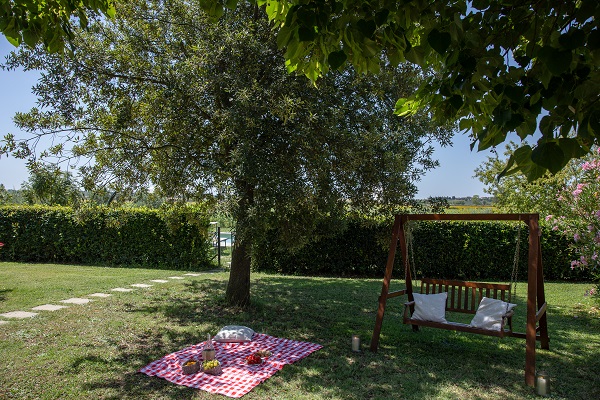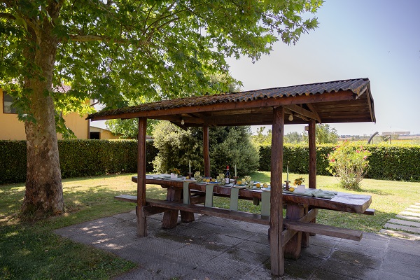 Buiten is de omheinde tuin met groot overdekt terras met picknicktafel om aan te eten. In de tuin staan ligstoelen en een schommelbank voor een relaxmoment.