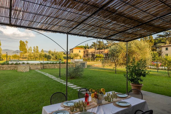 Buiten is een gezellig pergola-terras, dat uitkijkt op de grote tuin en het zwembad. De tuin is omgeven door een haag planten.